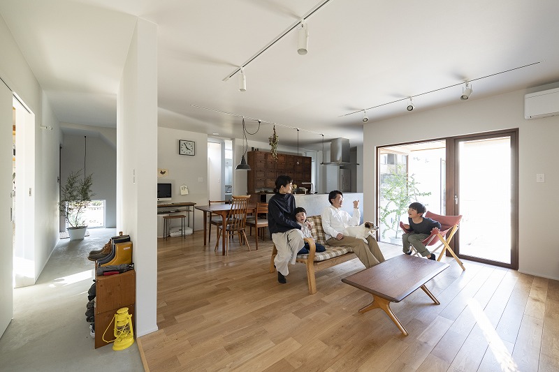 玄関を入ると土間が伸び、すぐに広々としたLDK!まさに「開放感たっぷり」という一文がぴたりと当てはまるN邸。「『家なんてまだまだ先』と考えていたんですが、今となってはそれがもったいないと思えるほど、この家での暮らしが快適すぎて」とNさん。もともと、夫婦ともにインテリア好きというNさん。新しい家では、好きな家具に囲まれて過ごしたい、という夢も。キッチンに鎮座するアンティークの棚もそのひとつ。「ヨーロッパの郵便局で使われていたものなのですが、お店のインスタグラムで見つけて一目惚れ。でもかなりの大きさなので、家ができるまで約1年半、お店の倉庫に預かってもらっていたんです(笑)」。いつか、と考えていた人生のお楽しみ、今すぐ手に入れて、大正解!だったよう。