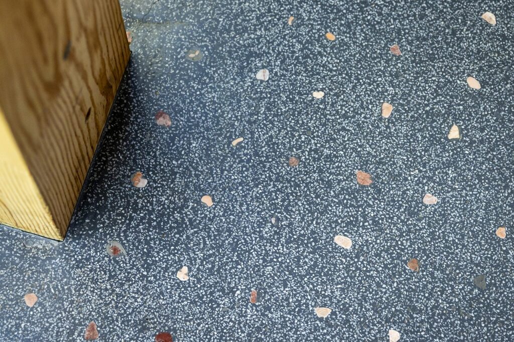 明太子をイメージした約14,000 粒の赤い石を手作業で削り上げ、4.5cm ピッチのグリット状に丁寧に並べ、研ぎ出した床