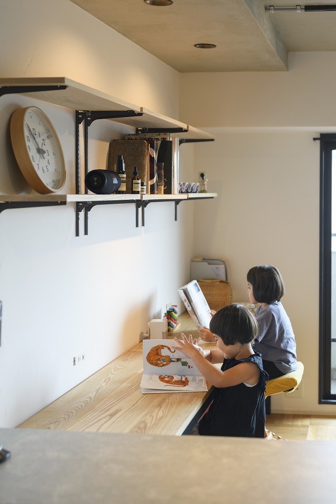 Aさん家族が暮らしていたのは、久留米市内の賃貸マンション。大雨が降ると決まって目の前の道路が冠水するため、子どもが小学校に入学するタイミングに合わせて、中古マンションを購入してリノベーションをしようと考えていたという。「会社を探す中で、物件探しから一緒にできることやHPに掲載されている施工事例がとても素敵だったことからユナイテッドホームズさんにお願いしようと思いました」と奥様。最後は、建築士の人柄で決めたという。ハザードマップや小学校の校区、利便性など、譲れない条件を優先しながら慎重に選んだのは、奥様の勤務先にも近い高層マンション。子どもたちが大きくなっても主要駅まで徒歩圏内と立地が良い。「最初に希望していた広さより狭くなってしまいましたが、そこは〝匠〟がどうにかしてくれるだろうと決めました(笑)」と明るく笑う奥様。尊敬の念を込めて〝匠〟と呼ぶのは、ユナイテッドホームズの建築士のこと。HPで見たその世界観に惹かれたと話す奥様もまた素敵な感性の持ち主だ。リビングには、見るからに年代物という雰囲気を醸し出すエイゾーのテレビや言わずと知れたカリモク60のKチェア2シーター、アマダナのウォーターサーバーなど、奥様が独身時代から大切にしてきたモノがしっくりと空間に馴染んでいる。「デザイン性はもちろん、欲しいところに欲しい収納ができる間取りに満足していますし、室内の物干しポールなど、機能面でも凄く暮らしやすくなりました」と奥様。「打ち合わせから入居後のメンテナンスまで、何でも相談しやすいのも〝匠〟のおかげです!」と話してくれた。
