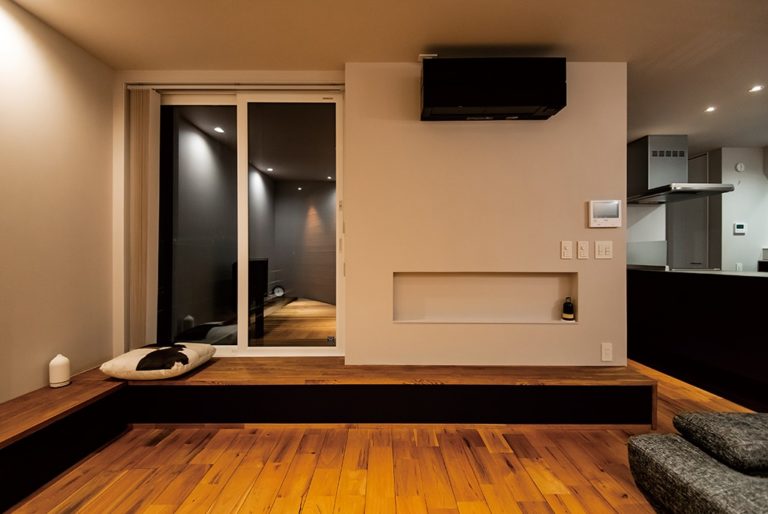 公園ではしゃぐ子どもたちの姿を眺めつつ、季節を感じるデッキはH邸の主役。間接照明に照らされ、夜の闇に浮かぶデッキの佇まいもまた趣深い