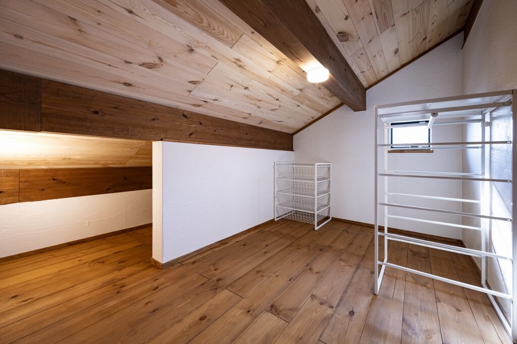 小屋裏収納。木と漆喰による調質効果は高く、衣類や寝具を大切に保管できる