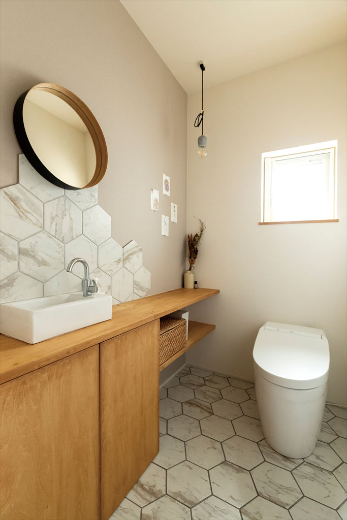 トイレは六角形のタイルをポイントに。壁のタイルは、家の完成後、ご主人が手貼りしたそう